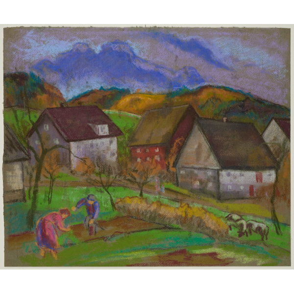 Fritz Schaefler, “Gartenarbeit”, 1937-1947, Pastell auf graubraunem Velin, 42,2 x 50,8 cm